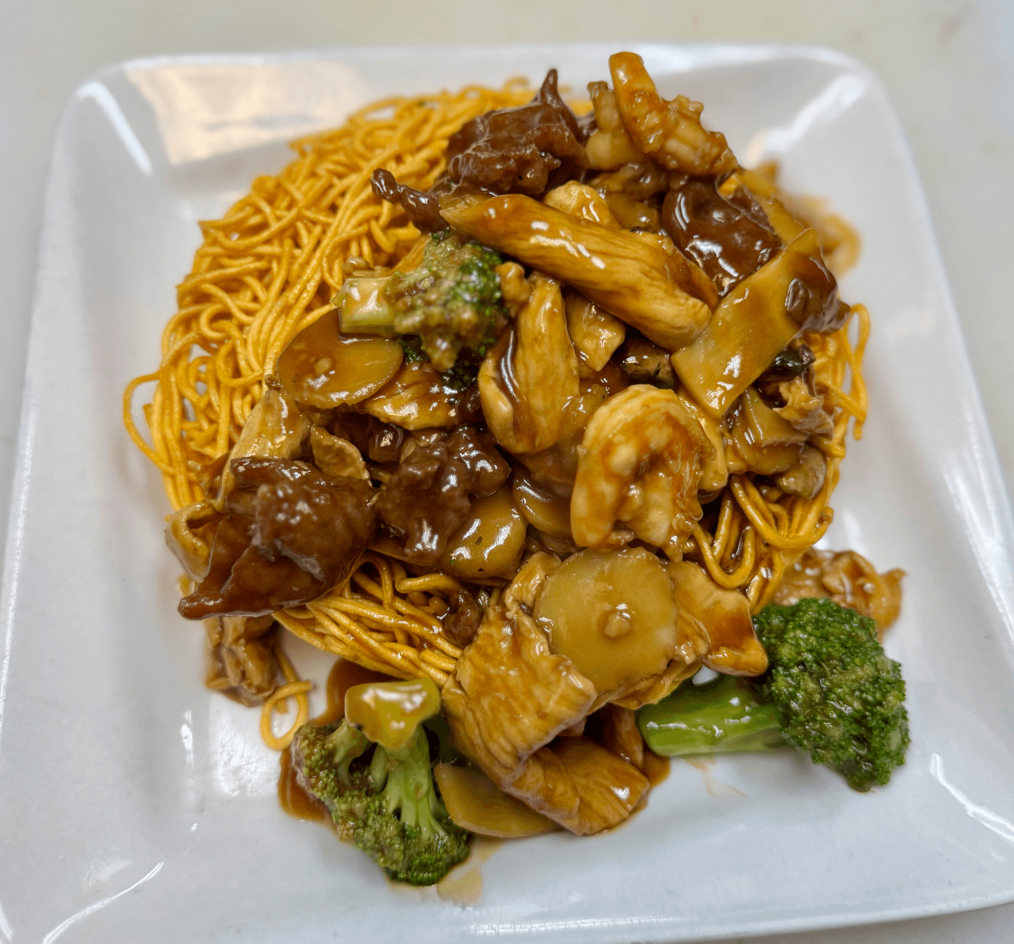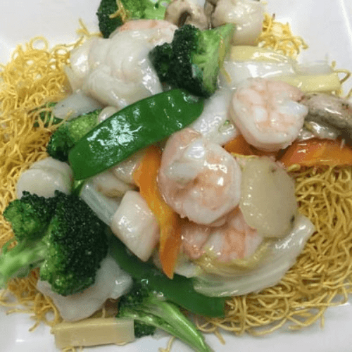 Chicken, beef, shrimp, broccoli, snow peas and carrots cooked in our special sauce on bed of crispy pan fried noodle