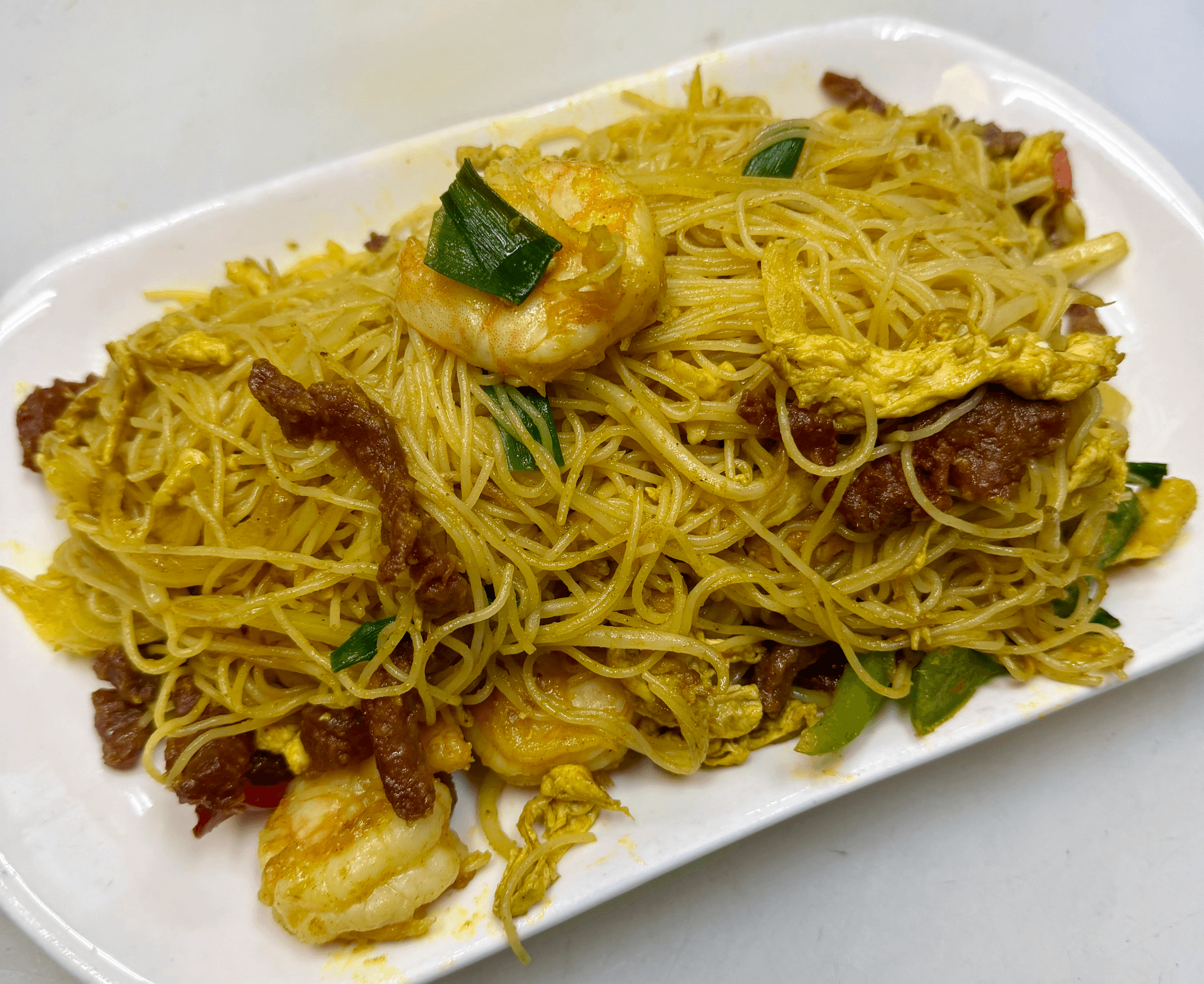 Thin rice noodle with shrimp, beef, chicken, eggs, bean sprouts green and white onions sauteed with curry sauce