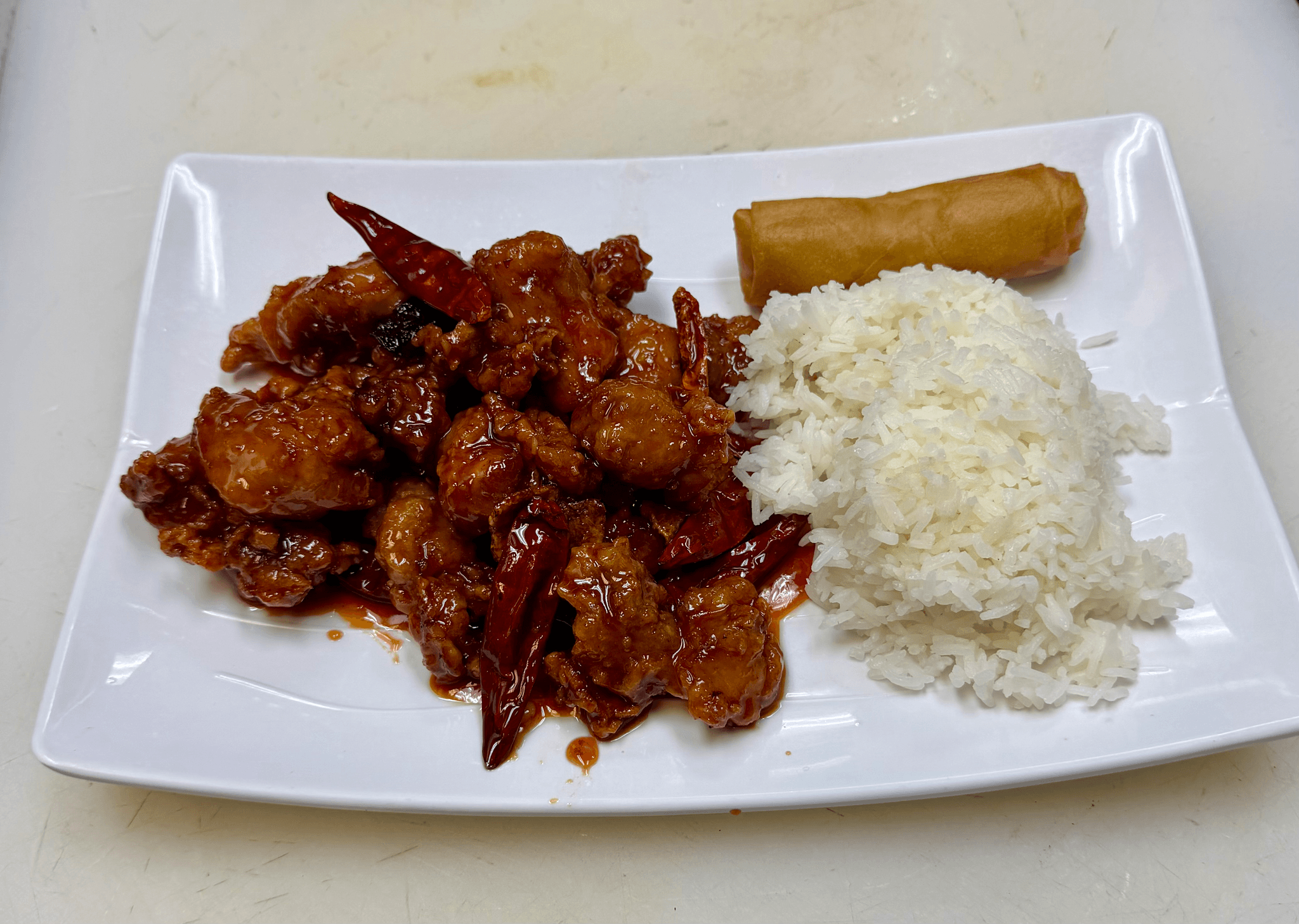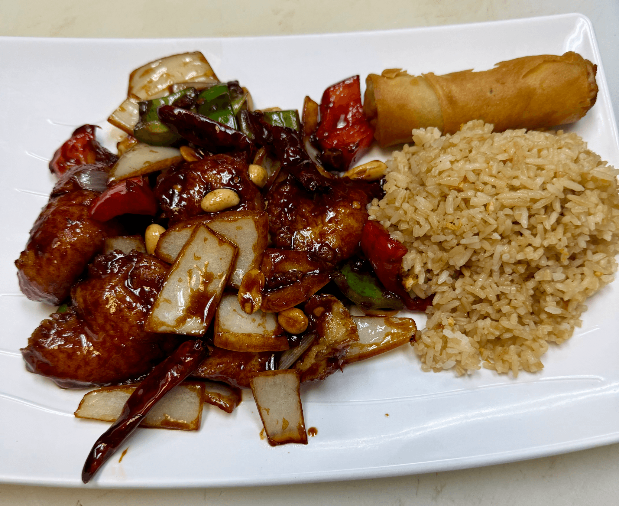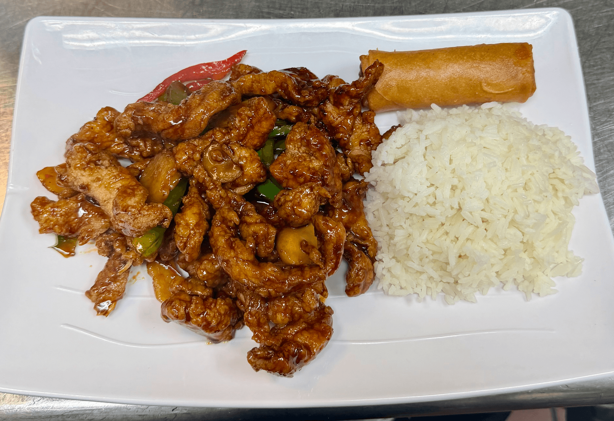 Lightly chunk white meat chicken with bell peppers and water chestnuts sauteed in our sweet and spicy sauce