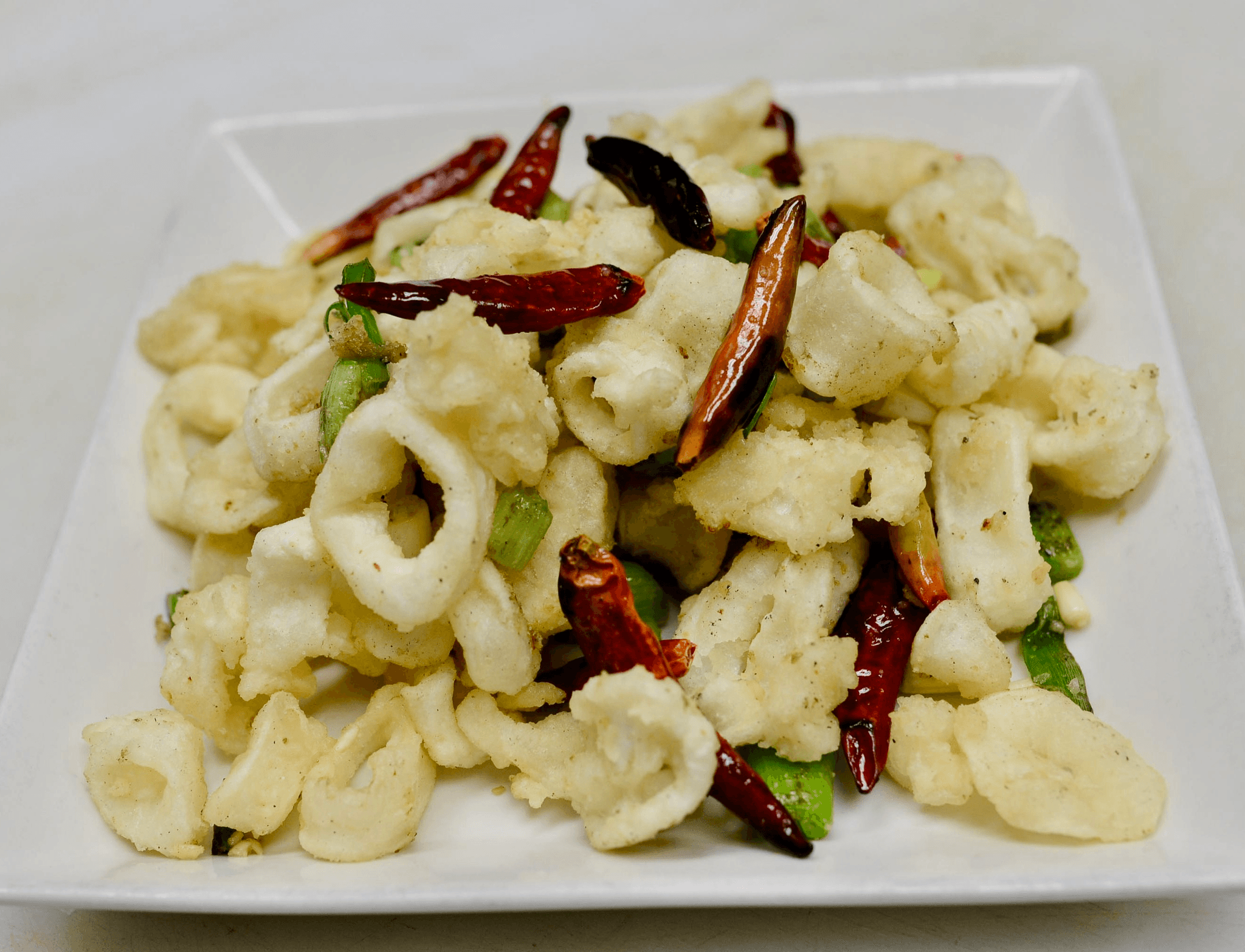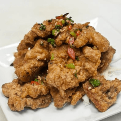 Lightly breaded calamari deep fried to crispy, then stir-fried with salt and pepper on top of shredded cabbage. Spicy.