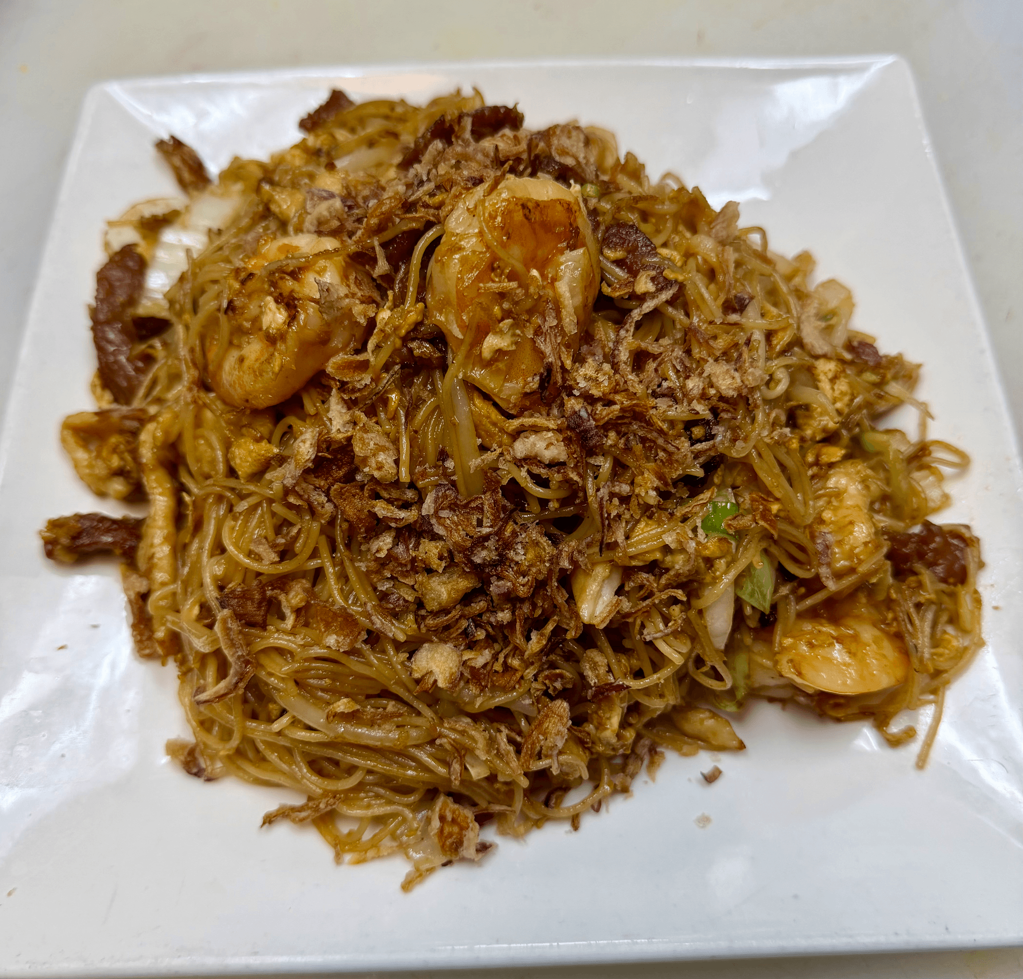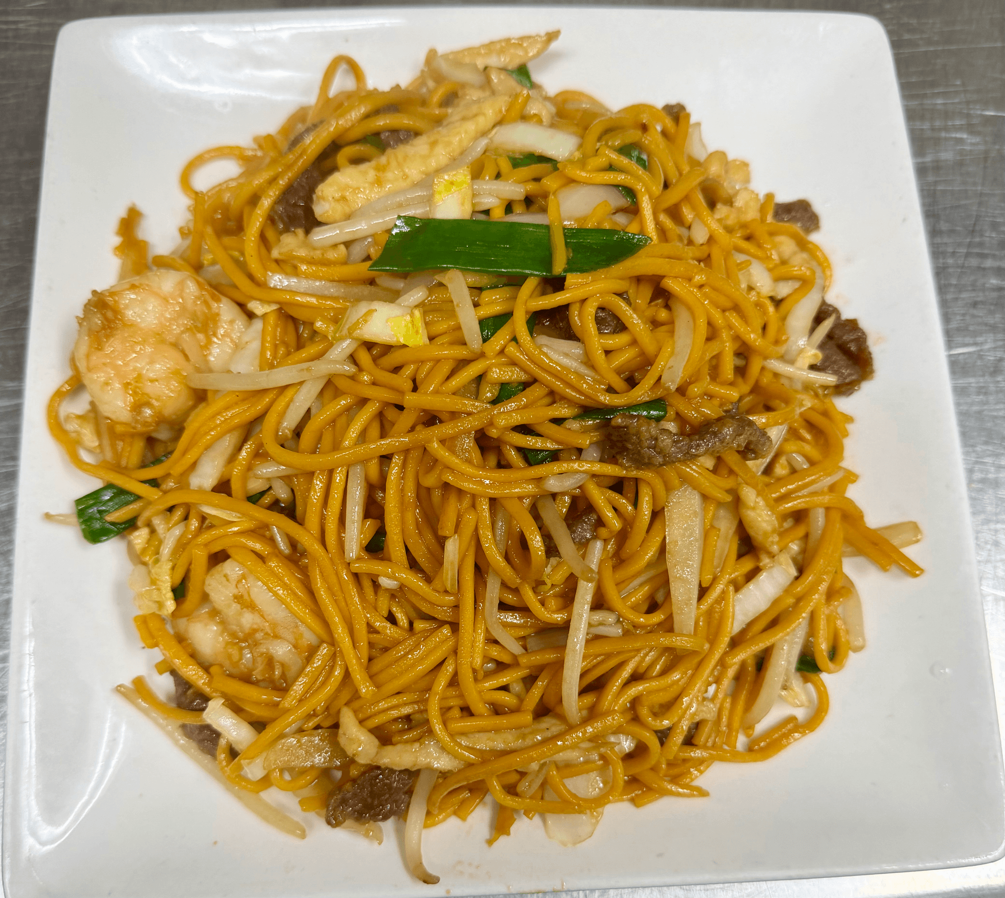Thin rice noodle with shrimp, beef, chicken, eggs, bean sprouts green and white onions sauteed with soy sauce