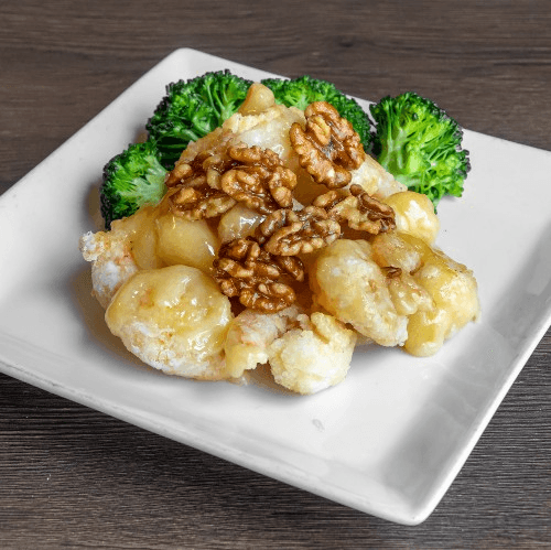 Lightly buttered crispy shrimp topped with glazed honey walnuts