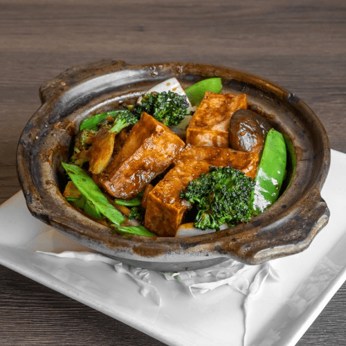 Fresh vegetables with fried tofu in special sauce served on sizzling hot pot