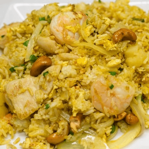 Chicken, shrimp, peas, carrots, white onions and cashews tossed with fried rice, spiced with curry