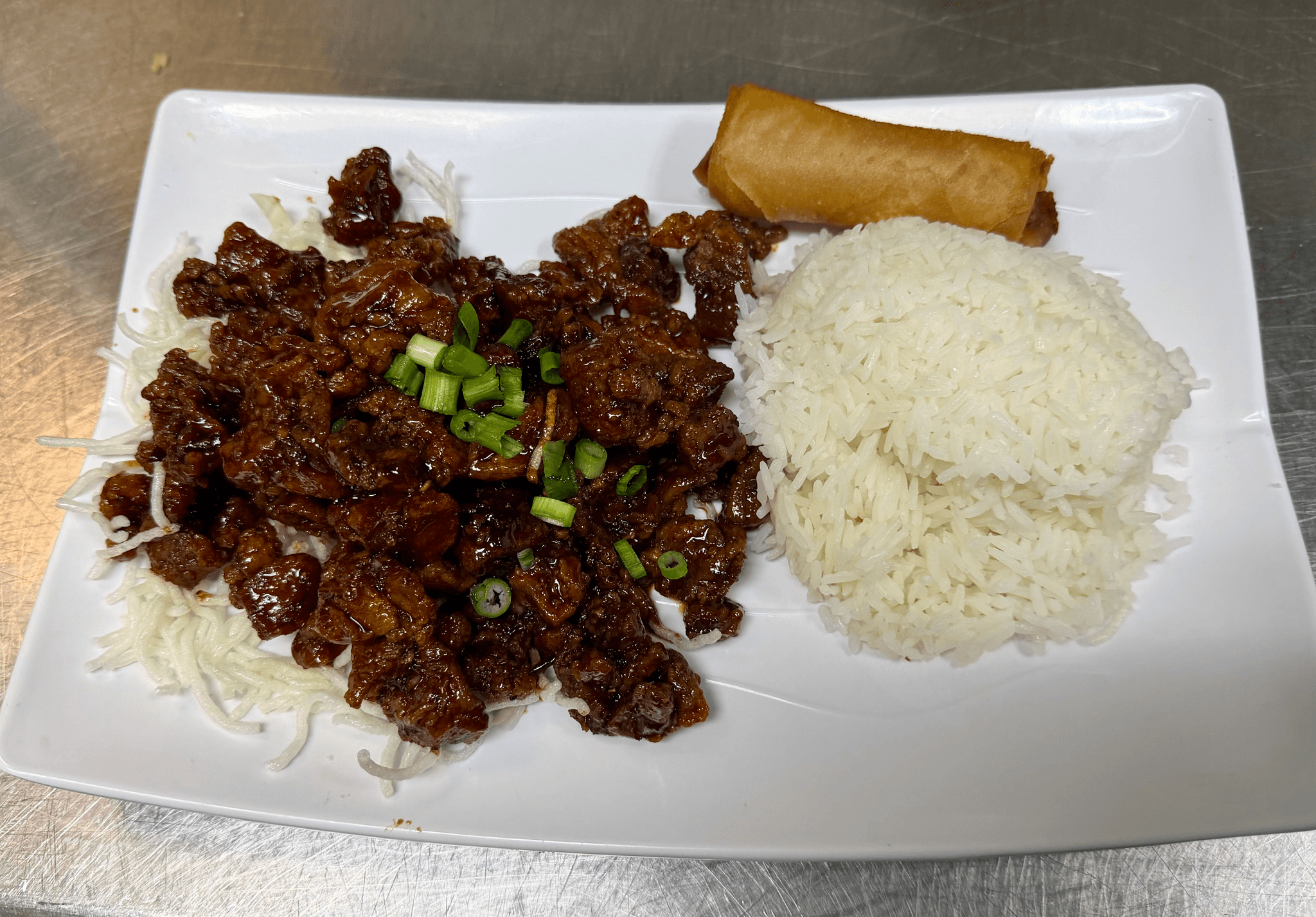 Tender beef lightly stir fried with onions, green onions and bamboo shoots