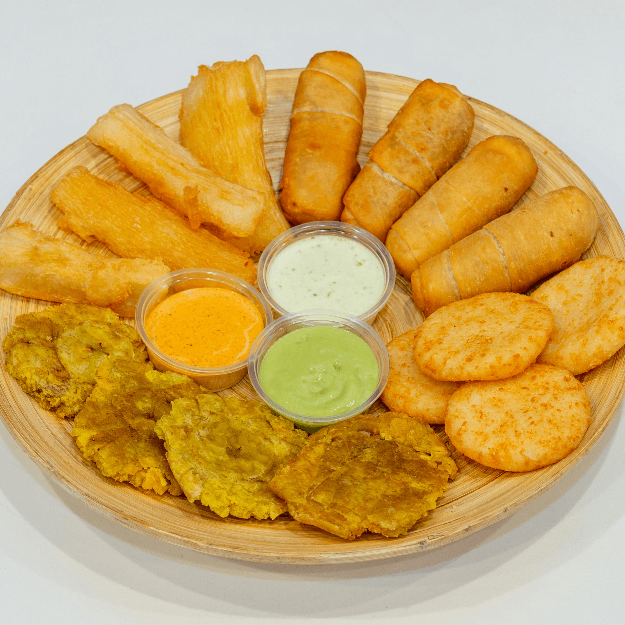 Sample plate with garlic sauce, guacamole and spice sauce. Includes: 4 tequeños, 4 tostones, 4 cheese arepitas, 4 fried yucas.
