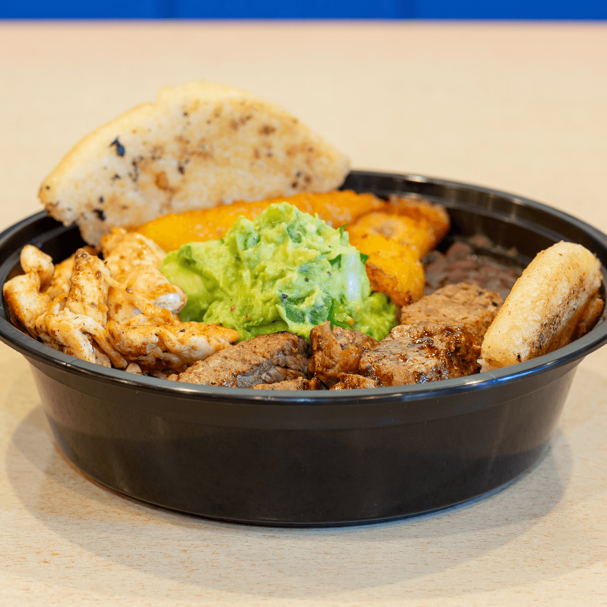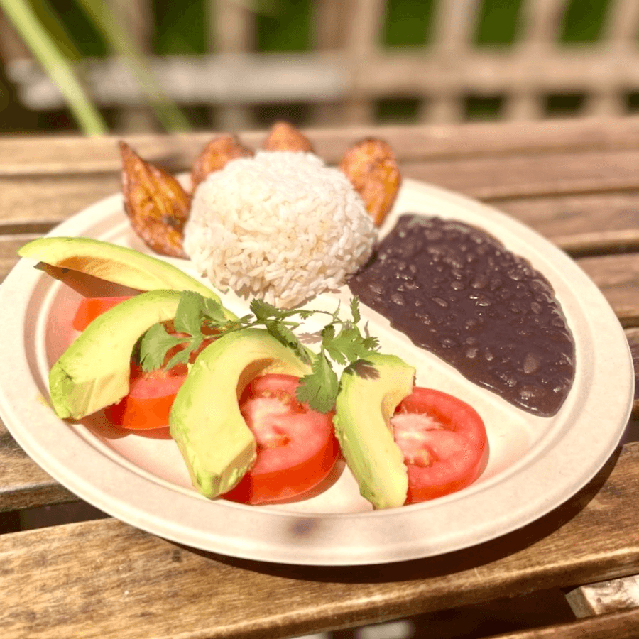 Rice, black beans, fried plantains, pico de gallo, avocado, and arepas with garlic sauce. Arroz, frijoles negros, plátano frito, pico de gallo, aguacate, arepas y salsa de ajo.