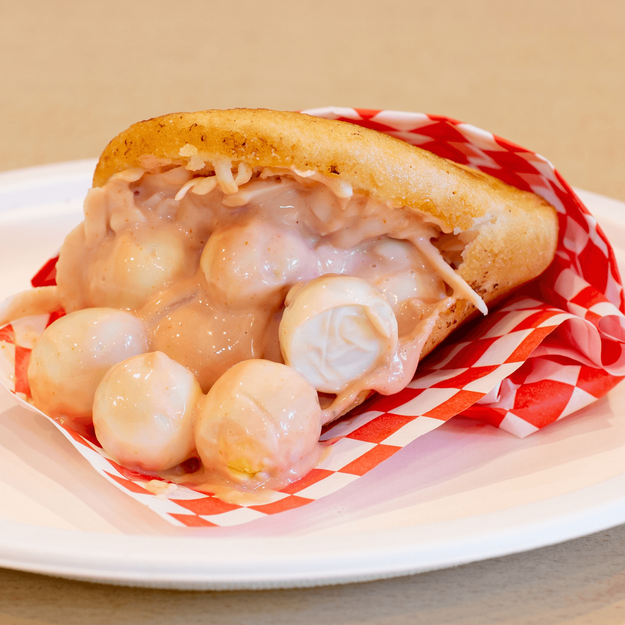 Arepa filled with quail egg, Gouda cheese and pink sauce. Arepa rellena con huevos de codorniz, queso Gouda y salsa rosada.