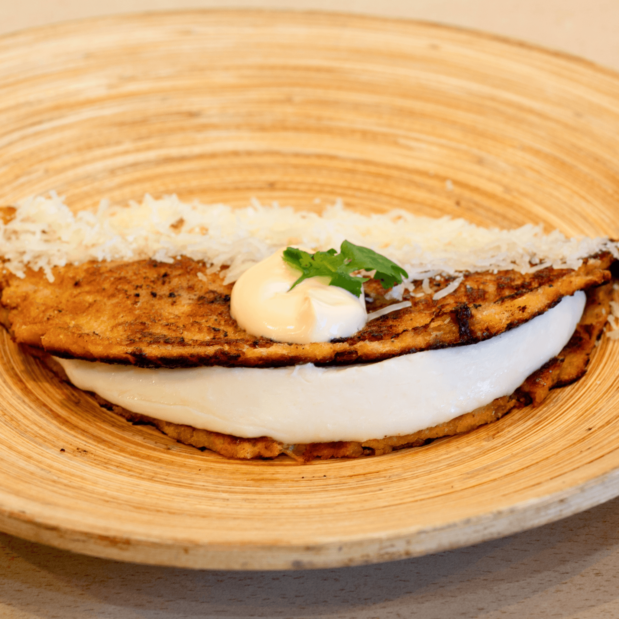 Arepa filled with white cheese, shredded chicken, plantains, guacamole and pico de gallo with avocado sauce. Arepa de queso blanco, pollo mechado, plátano, guacamole, pico de gallo y salsa de aguacate.