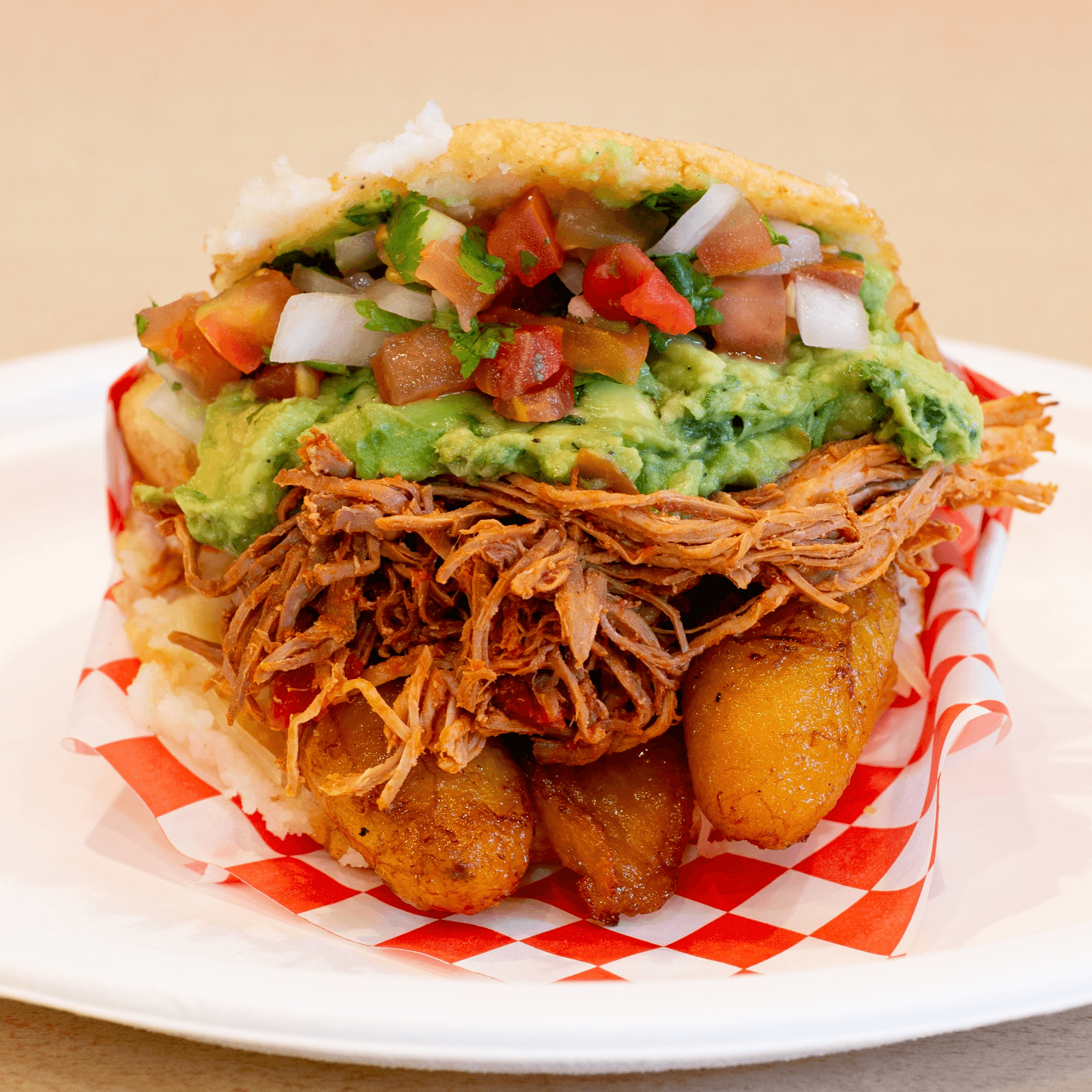 Arepa filled with shredded beef, or shredded chicken, black beans, white cheese and platains. Arepa rellena de carne mechada o pollo mechado, caraotas, queso blanco y plátano.