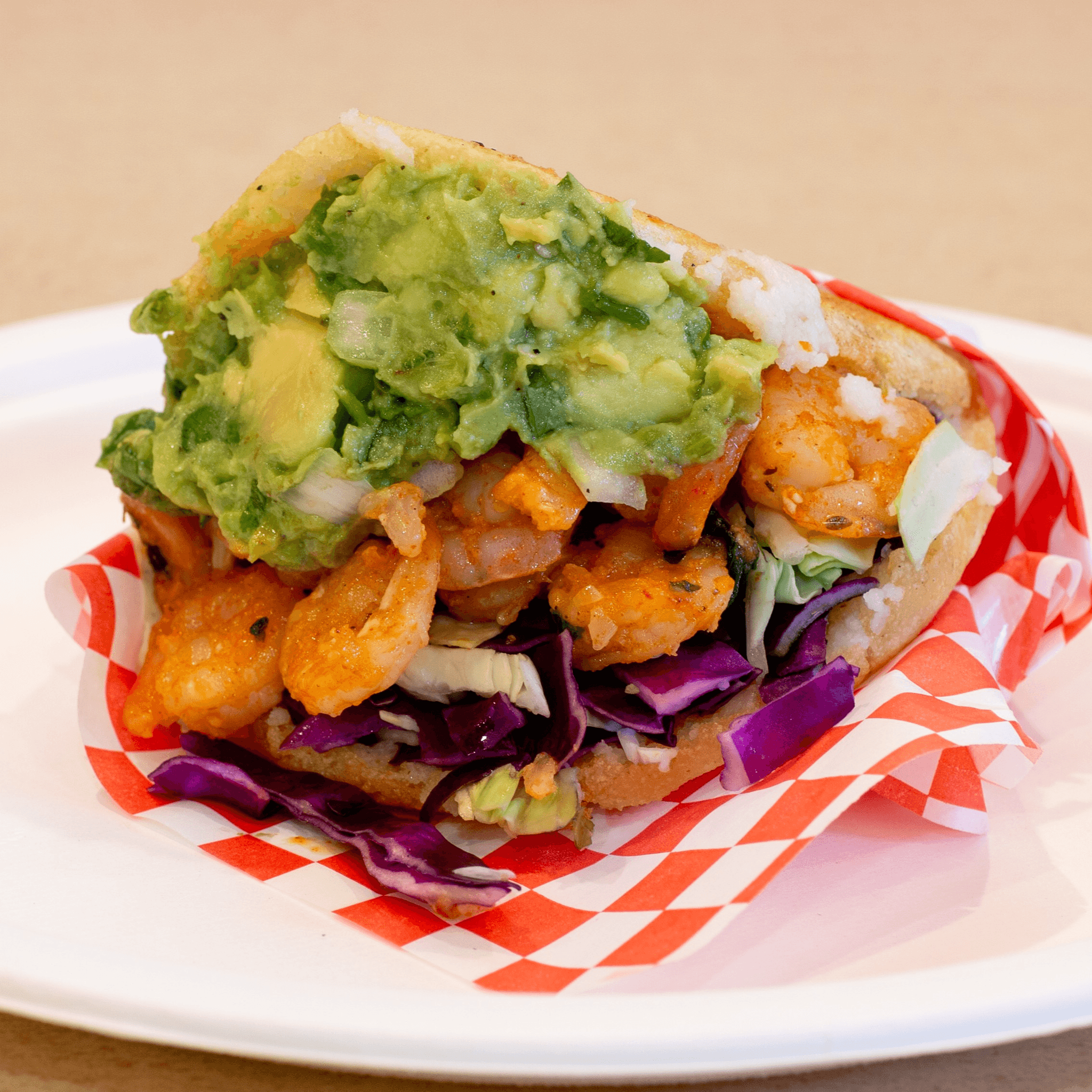 Arepa filled with cabbage, cajun shrimp and guacamole. Arepa rellena de repollo, camarones en salsa roja y aguacate.