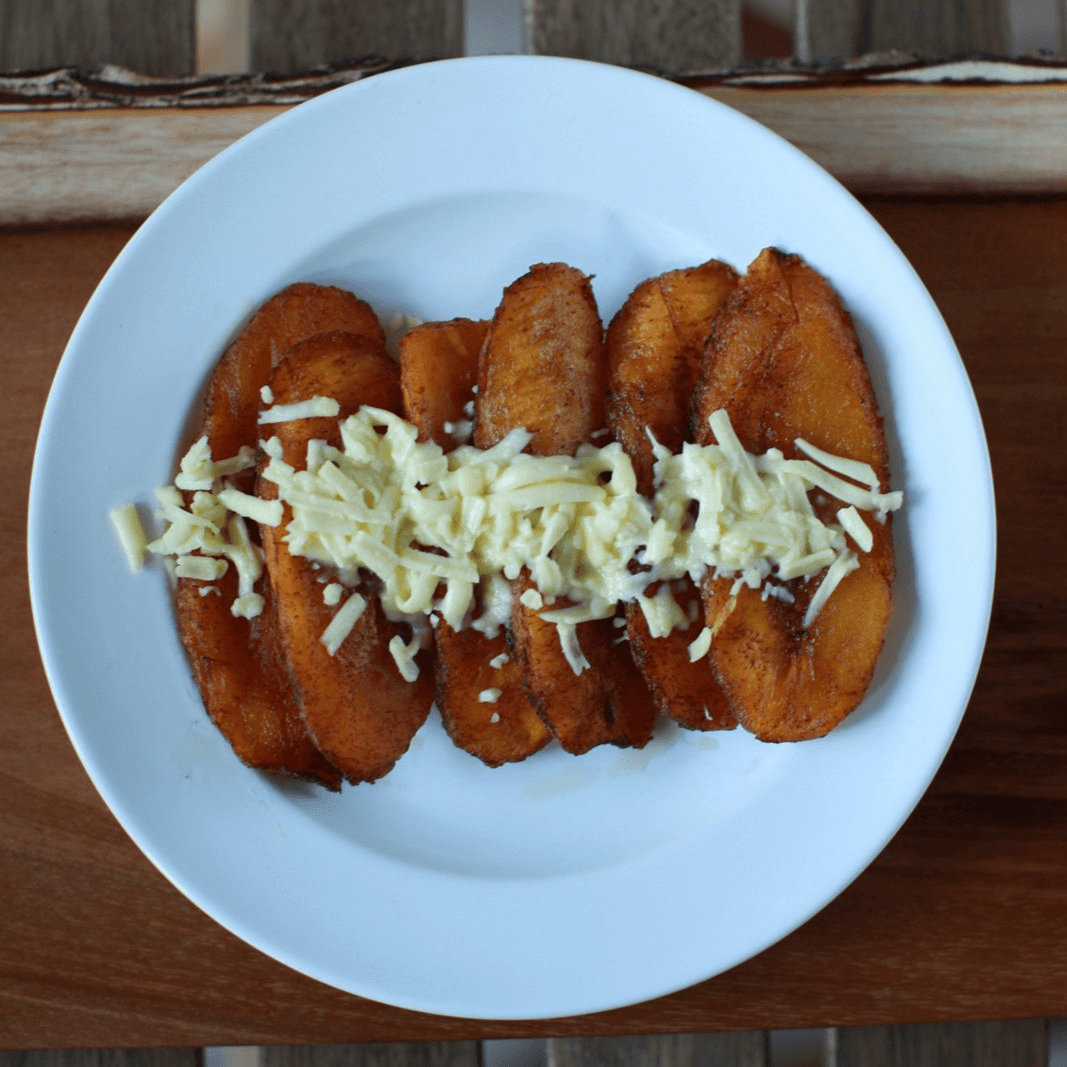 Crispy fried plantains topped with melted cheese — a savory-sweet Venezuelan classic.