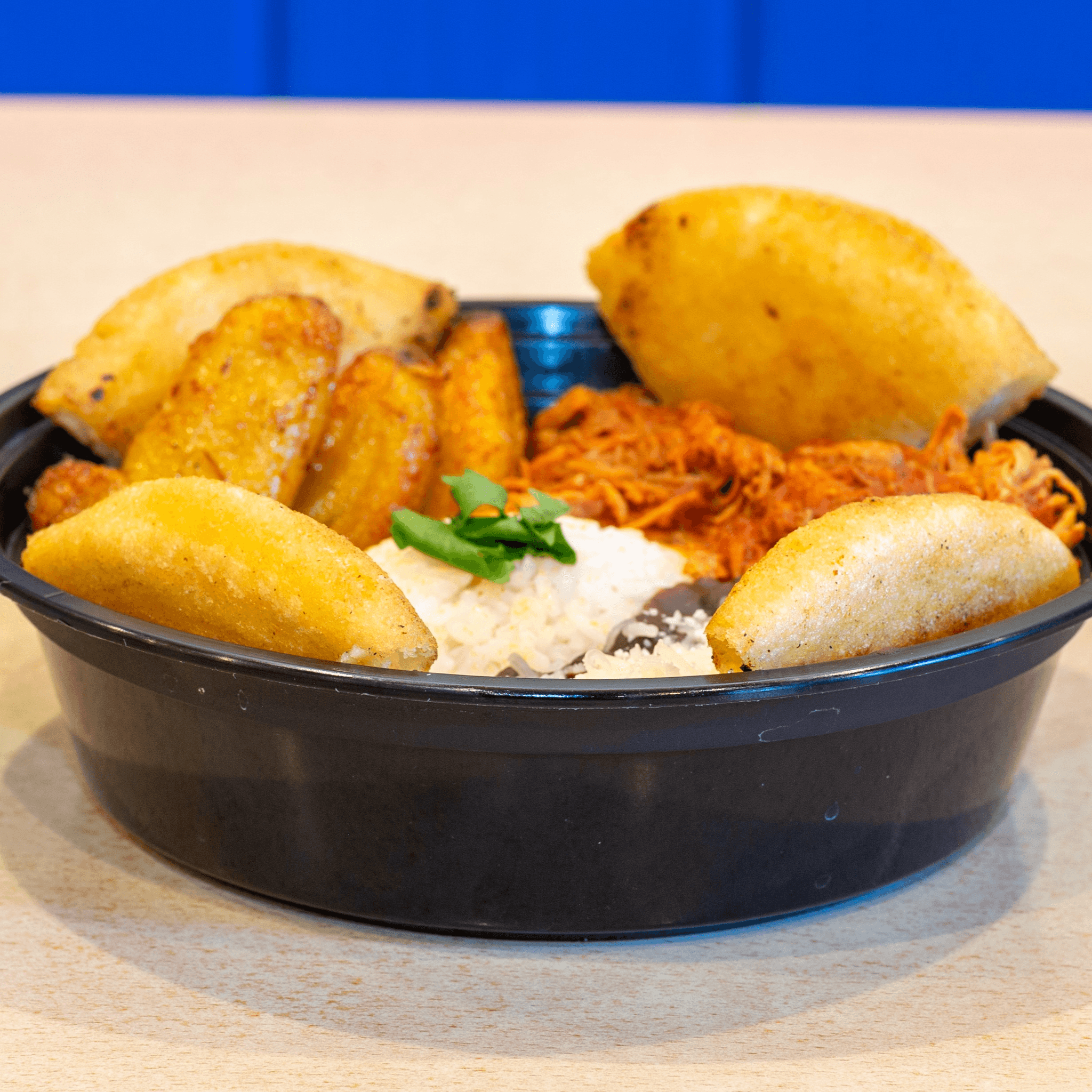 Black beans, rice, shredded beef or shredded chicken, fried plantains, cheese and an arepa. Frijoles negros, carne mechada o pollo mechado, plátanos fritos, queso blanco y una arepa.
