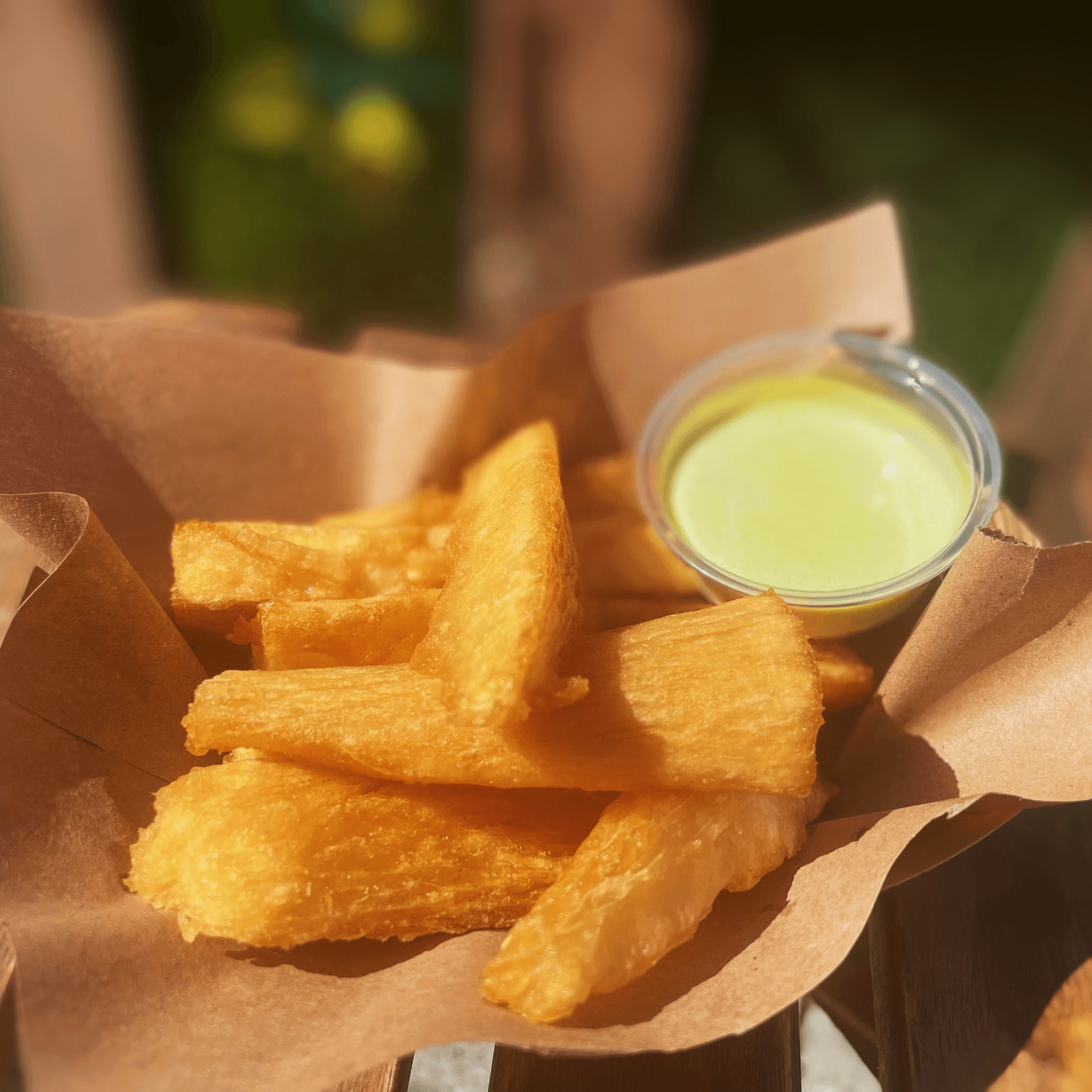 Fried yuca sticks served with garlic and spice sauce on the side.