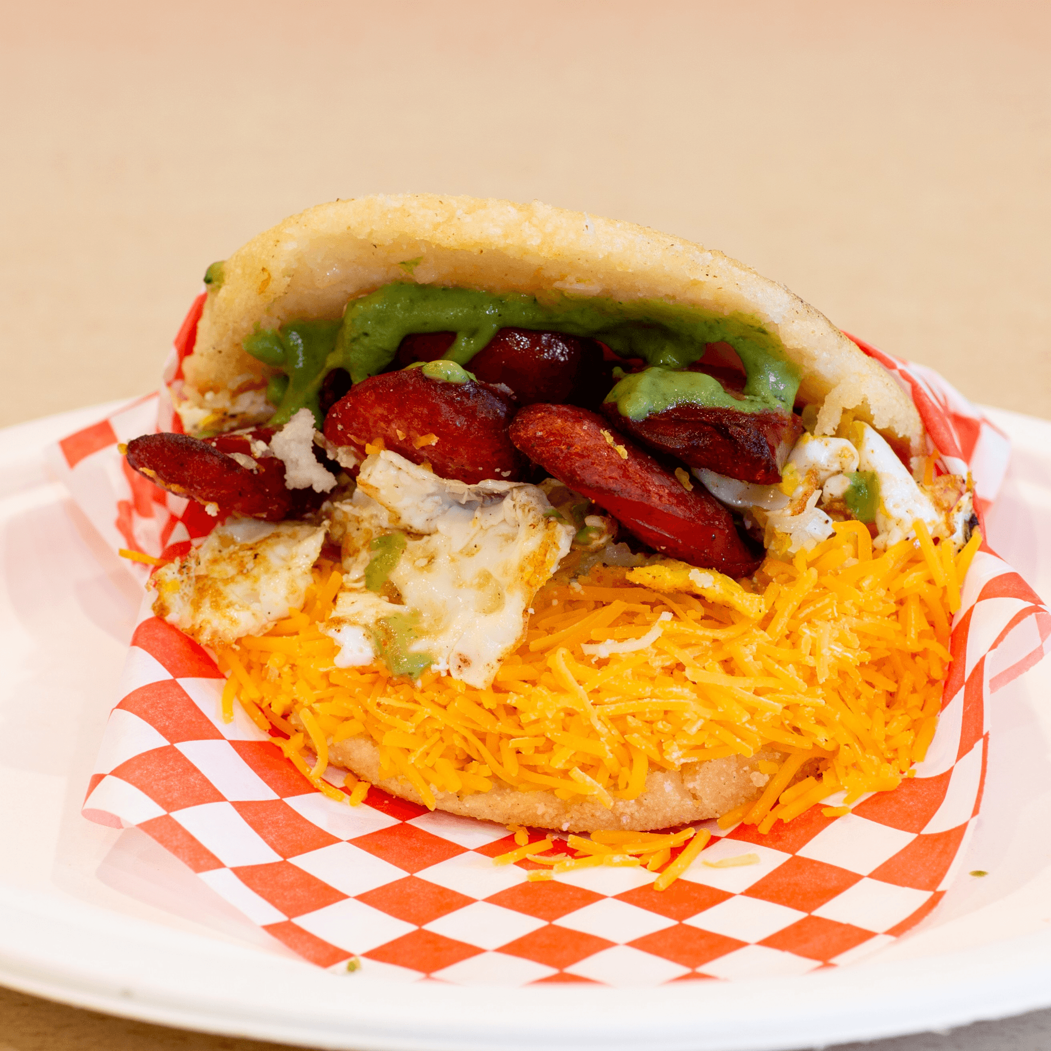 Arepa filled with yellow cheese, scrambled eggs, sausage and avocado. Arepa rellena de queso amarillo, huevo revuelto, salchichas y aguacate.