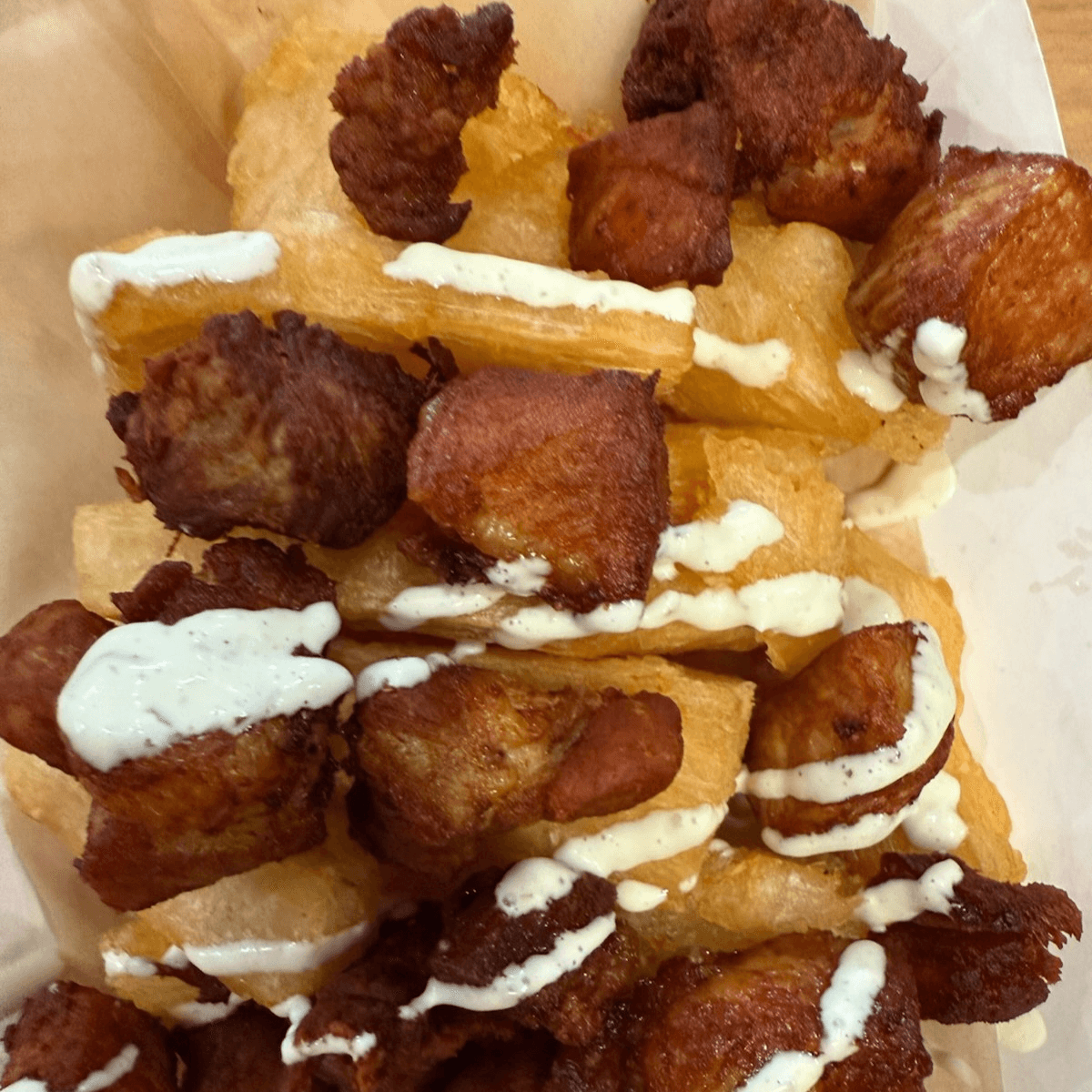 Fried yuca with fried pork or shredded beef with garlic sauce or spice sauce and guacamole.