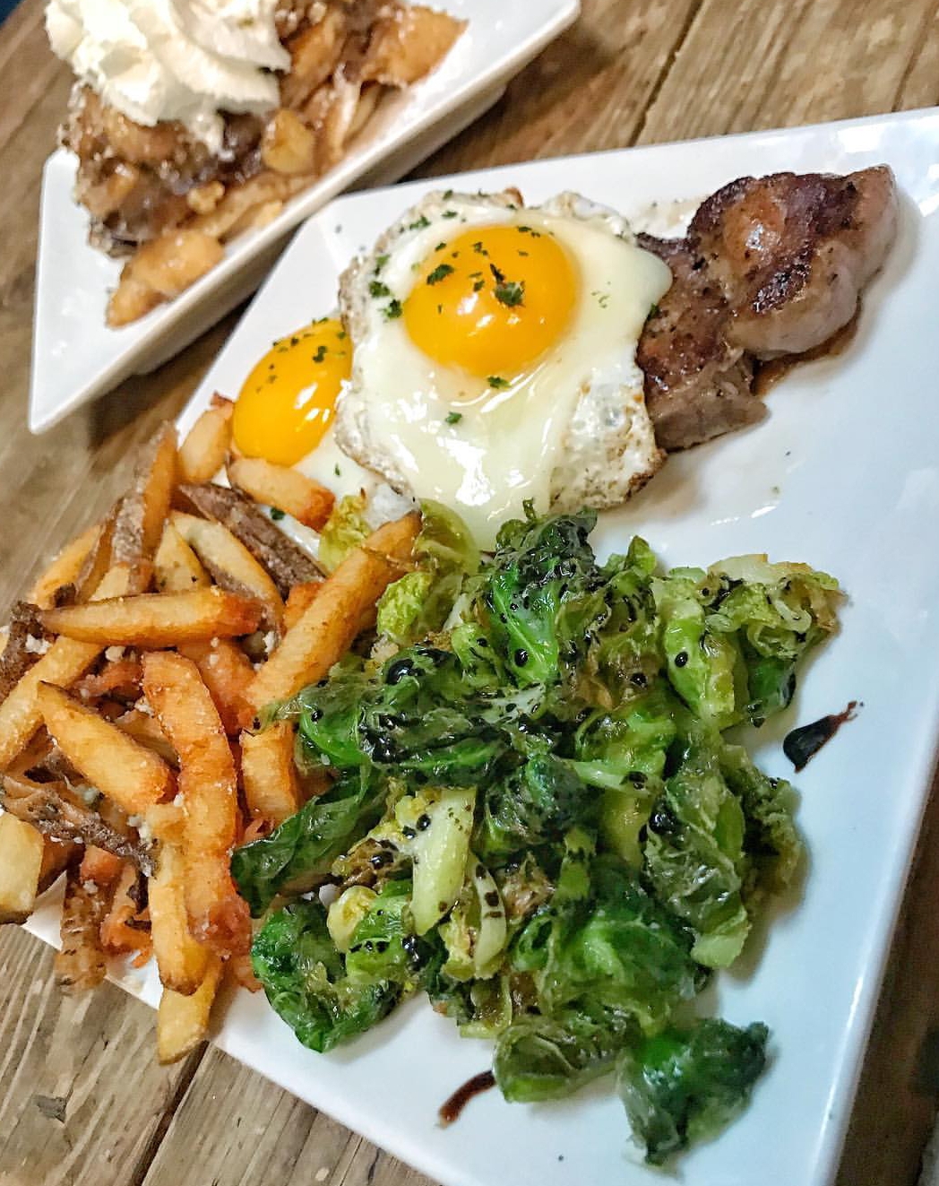 8oz New York Strip, 2 Fried Eggs, Crisp Brussel Leaves, Balsamic Onion Marmalade. Choice of Side
