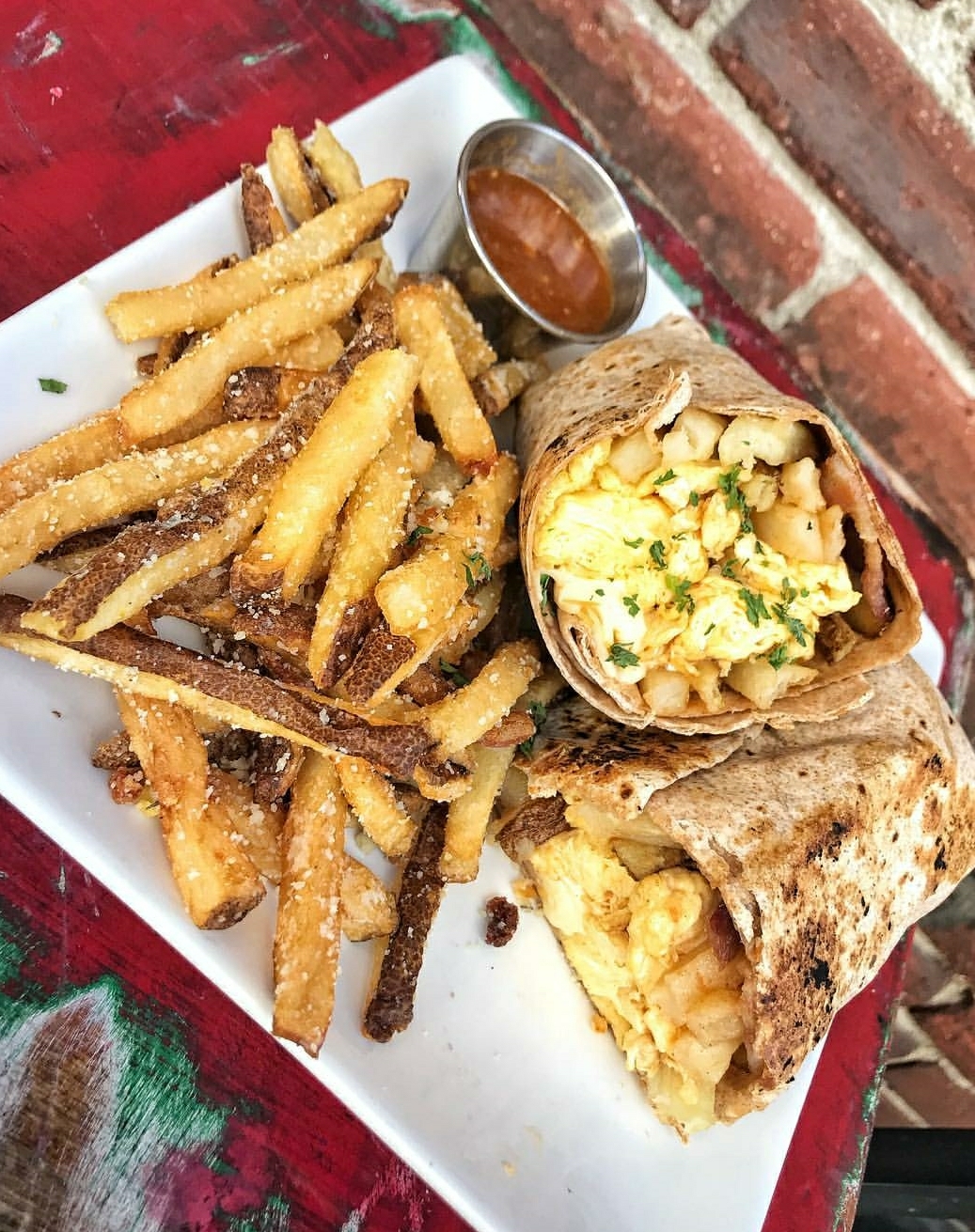 Breakfast Burrito with Choice of Bacon, Soy Chorizo or Chicken Andouille Sausage with Fluffy Scrambled Eggs, Crispy Potato and Jack Cheese in Wheat Tortilla. Yea, wheat...we told you it’s confused. Charred Salsa on the Side. Choice of Side