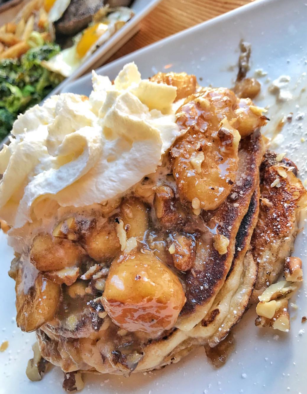 Bananas Foster Pancakes with Rum Flambéed Bananas over 3 Fluffy Buttermilk Pancakes, Toasted Walnut and Whipped Chantilly Cream