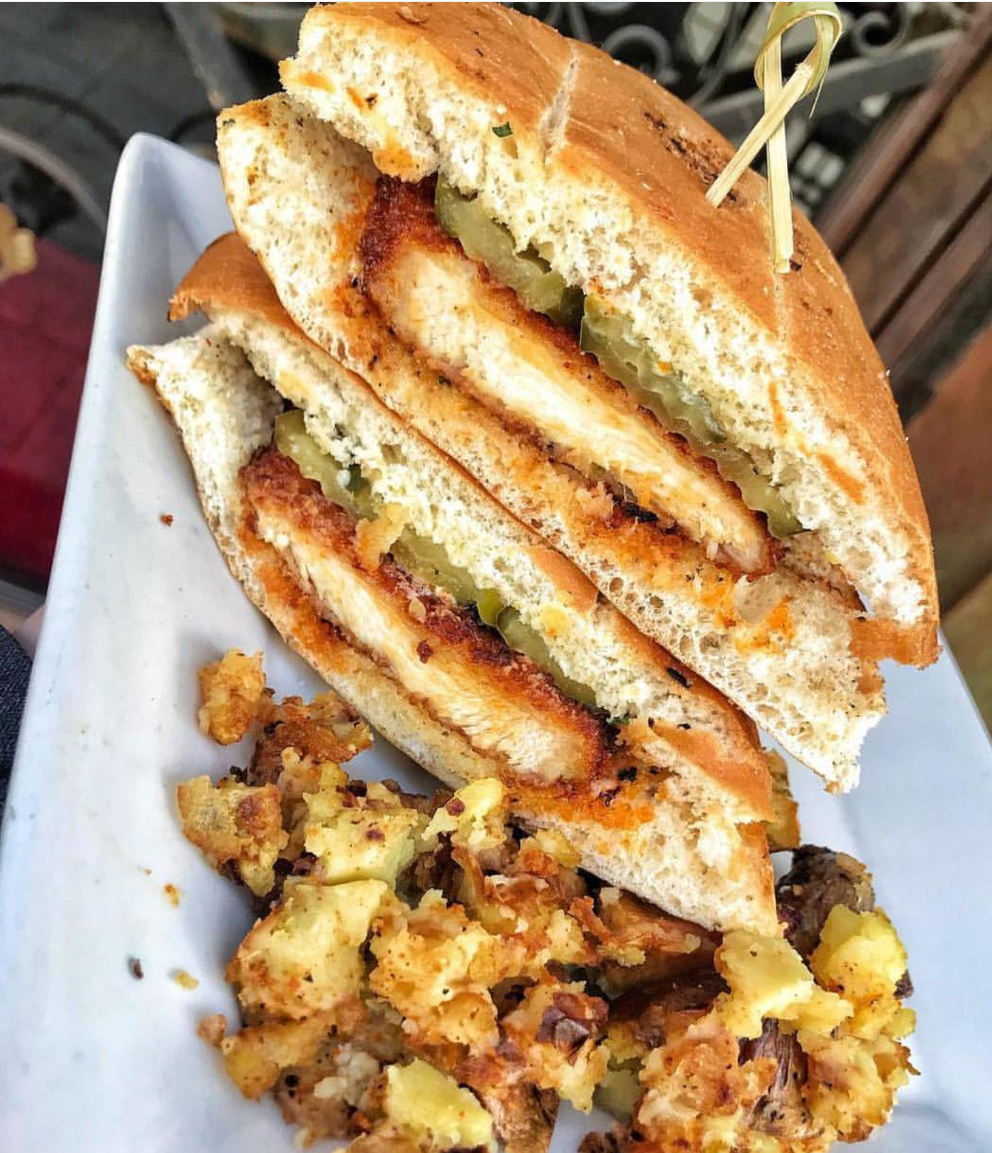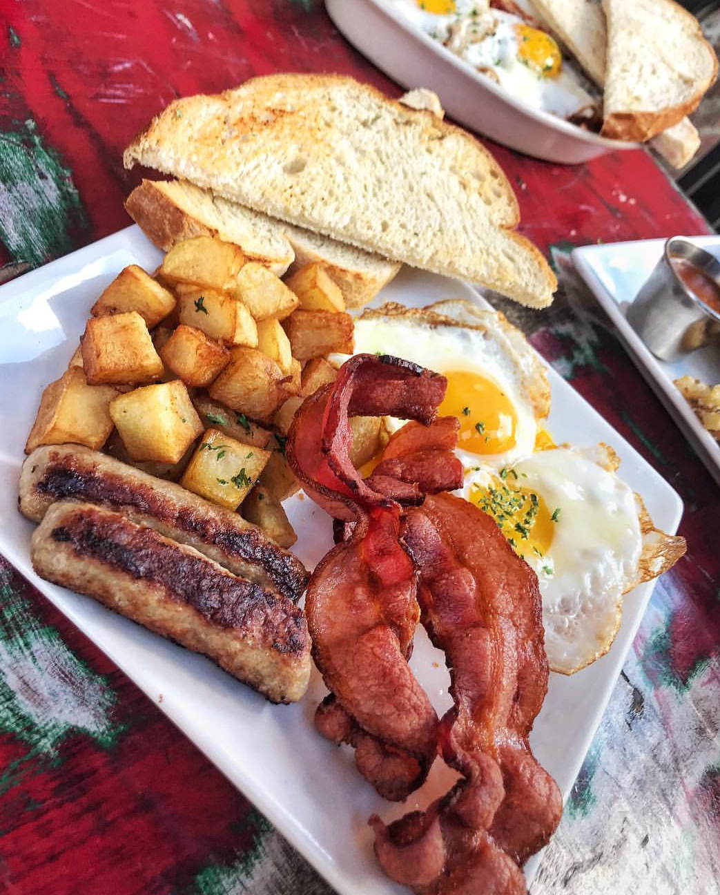 Traditional Starter with 2 Fried or Scrambled Eggs, Cajun Parmesan Potatoes, Choice of Bacon or Chicken Andouille Sausage and Grilled Sourdough