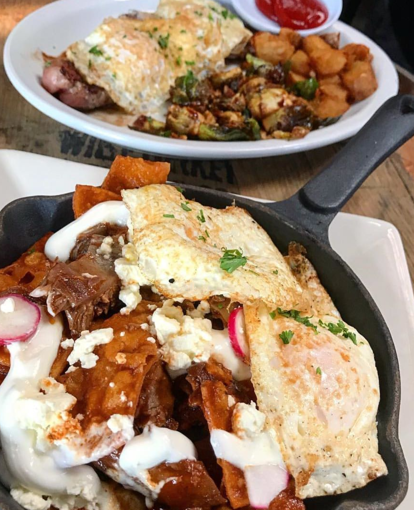 Cajun Spiced Potato Hash with Chopped Bacon and Caramelized Onion Topped with 2 Fried Eggs, Charred Salsa, Sour Cream and Micro Greens