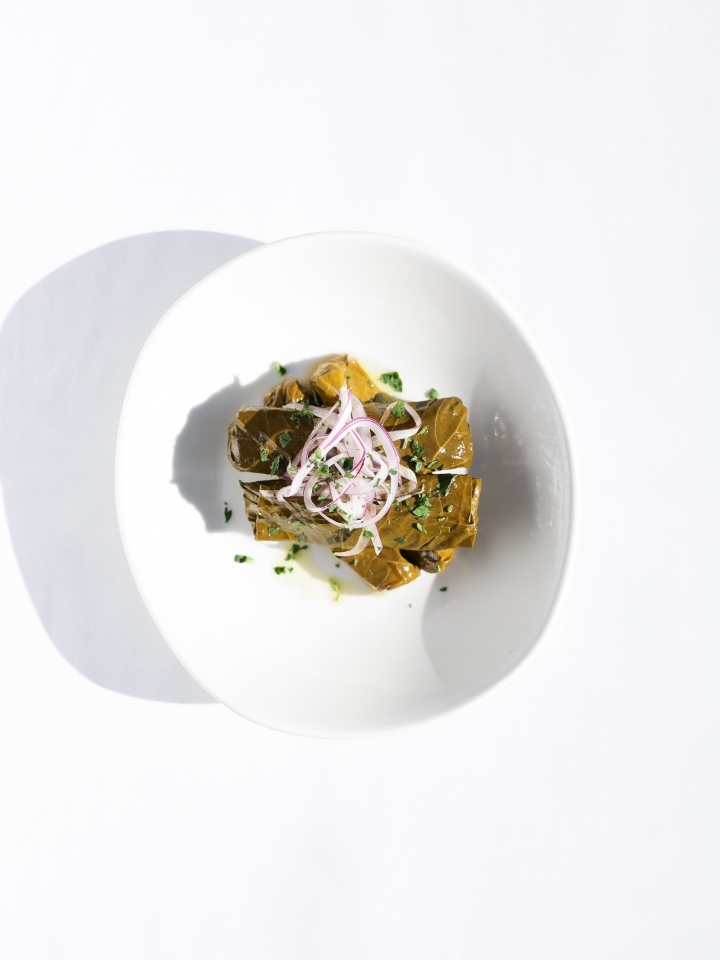 Grape leaves filled with rice & herbs. Topped with red onion and lemon (GF, DF, V, VG)