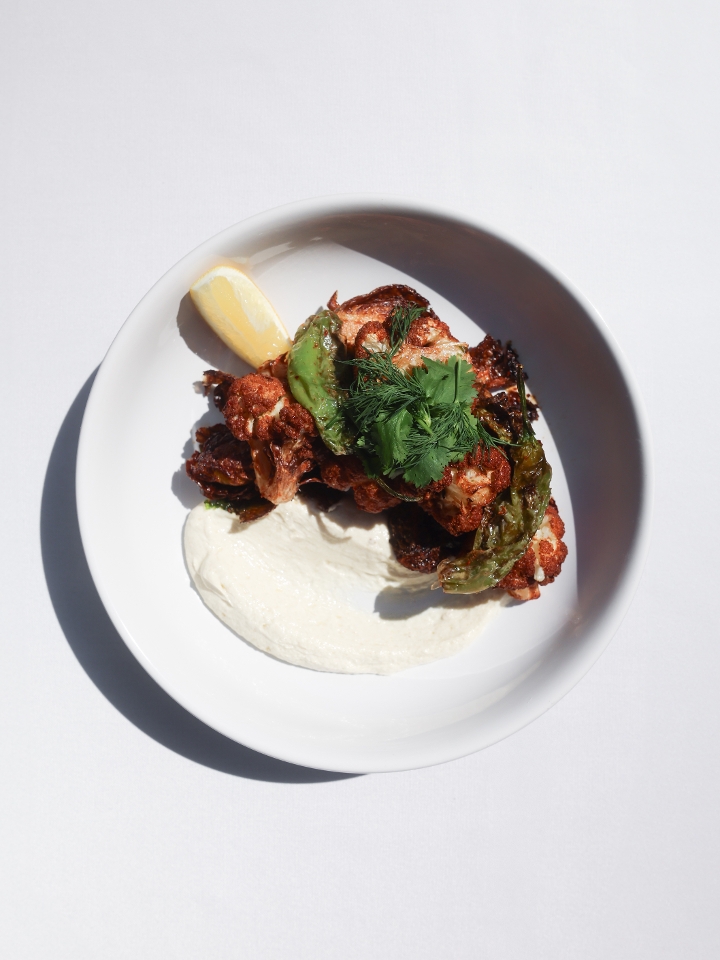 Fried with Brussel sprouts, Shishito peppers, tahini yogurt sauce, sesame seeds, pomegranate molasses and herbs
