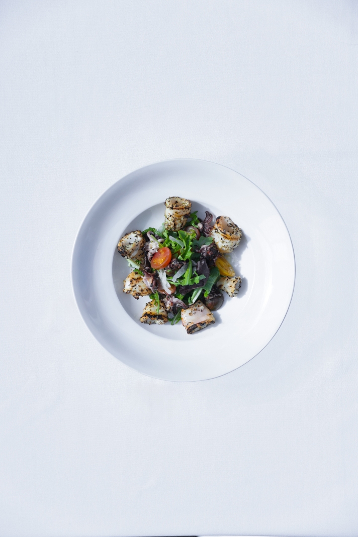 Grilled baby squid served over mixed greens, cherry tomatoes, tossed with a lemon herb dressing (GF, DF)