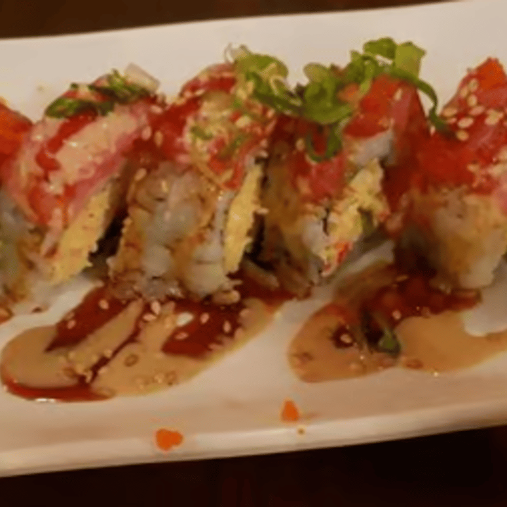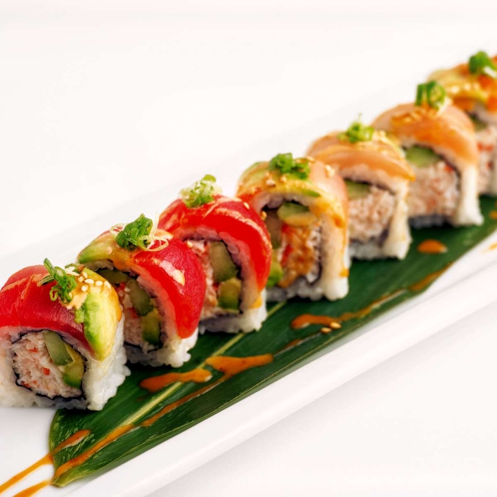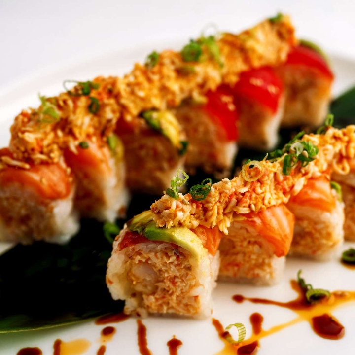 Shrimp tempura and spicy crab salad wrapped with soy paper, topped with Salmon, Tuna, avocado, green onion and spicy crab salad, served with eel sauce and chili oil