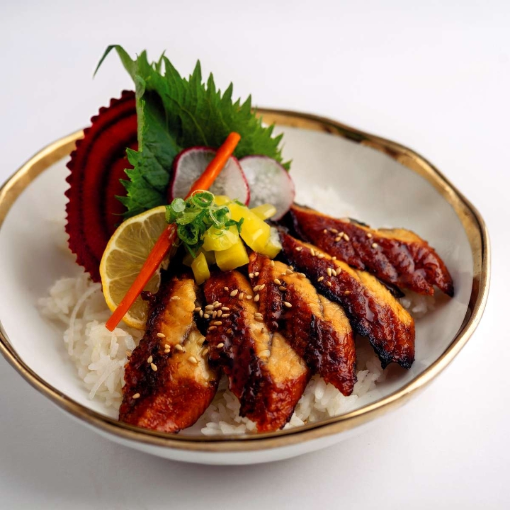 BAKED FRESH WATER EEL OVER THE BOWL OF SUSHI RICE, SERVED WITH EEL SAUCE