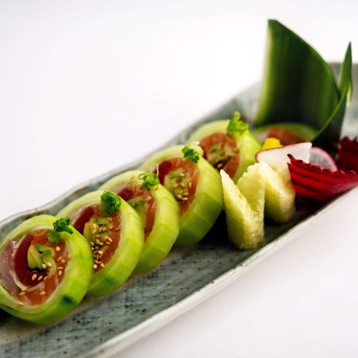 Spicy tuna, crab salad, pickled radish and avocado wrapped with cucumber served with spicy karashi sauce (Japanese mustard seasoning & Chili oil) and green onion