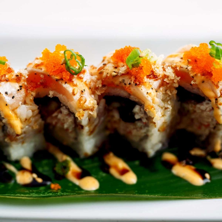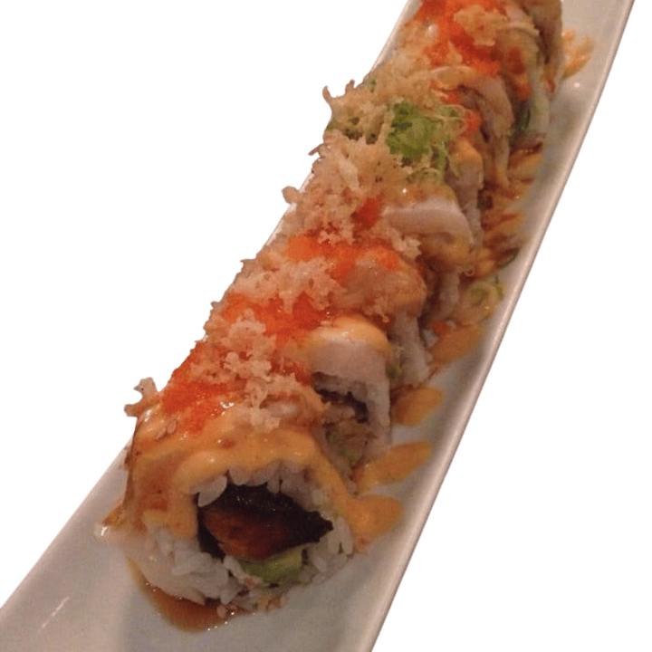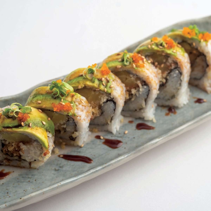 Shrimp tempura and crab salad inside, topped with avocado, served with eel sauce, spicy and sweet mayo