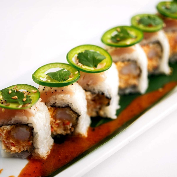 Shrimp tempura, jalapeno and pickled cucumber topped with Albacore served with sweet ponzu sauce (eel & ponzu sauce), chili oil, fried onion and green onion