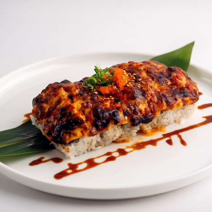 Baked langostino with spicy mayo over with California roll, served with eel sauce, topped with masago, green onion