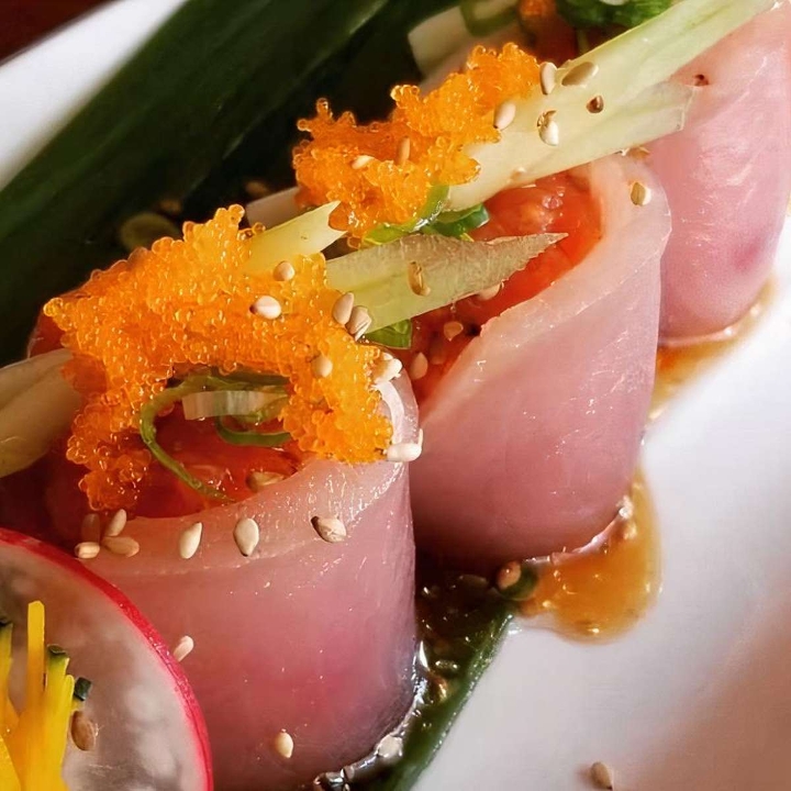 Spicy tuna and cucumber wrapped with Albacore, masago(Smelt Roe) served with karashi sauce