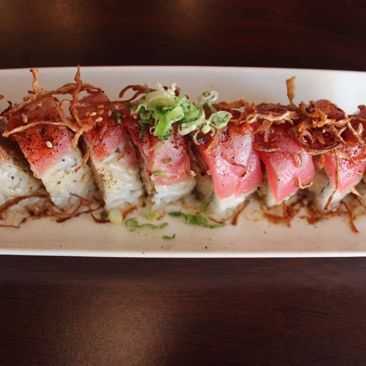 Shrimp tempura and avocado inside, topped with tuna, masago(Smelt Roe) and green onion, served with eel sauce and chili oil