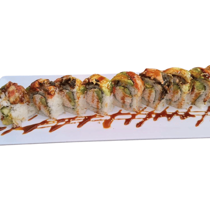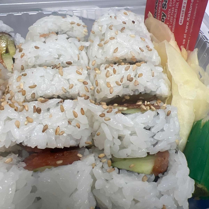 California roll(Crab salad, cucumber & avocado inside) topped with baked eel and avocado served with eel sauce