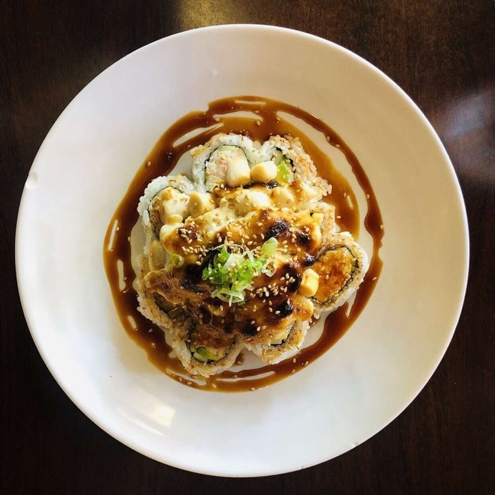 Baked scallop with mayo over California roll(Crab salad, cucumber & avocado inside) served with eel sauce topped with green onion