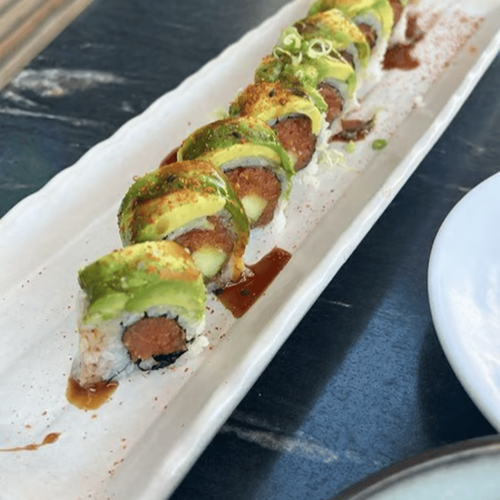 Spicy tuna and cucumber inside topped with avocado and green onion served with eel sauce and chili oil
