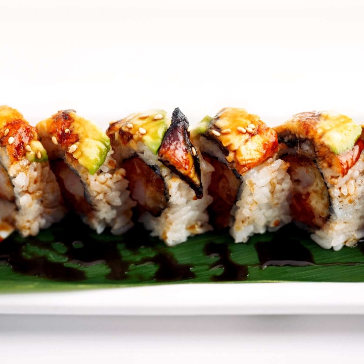 Shrimp tempura and spicy tuna inside, topped with fresh water eel and avocado served eel sauce